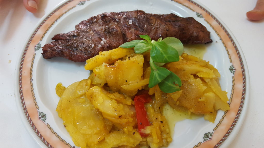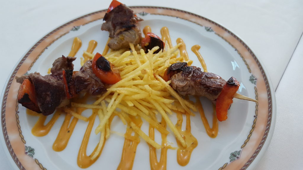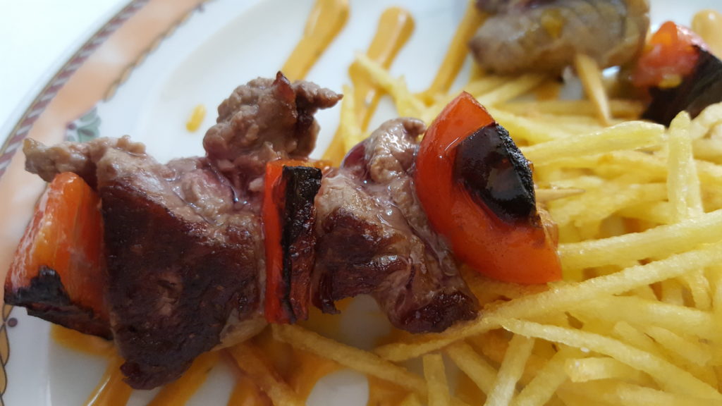 Nos ofrecieron una cerveza o vermouth mientras pensábamos qué nos apetecía comer ese día tan especial. Esa primera consumición vino acompañada de una espléndida sorpresa: un pincho de chuletón de ternera a la parrilla, con salsa de mostaza vieja. Grata sorpresa, muy grata. Mimar una tapa al cliente es un buen síntoma.