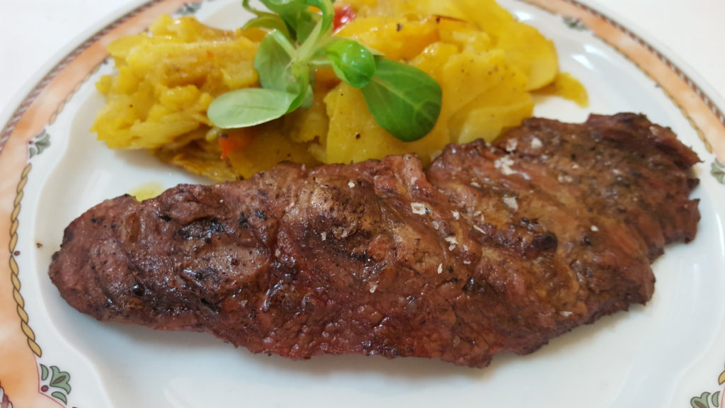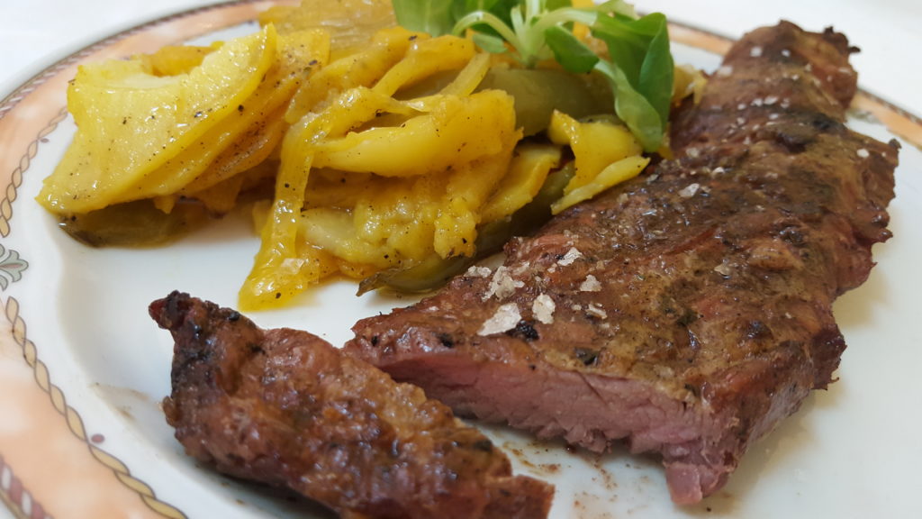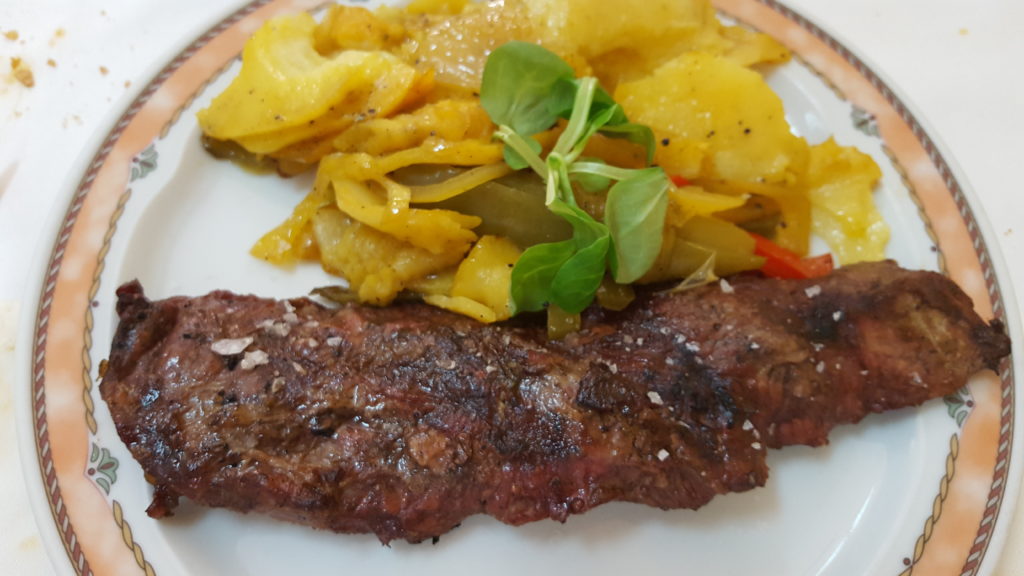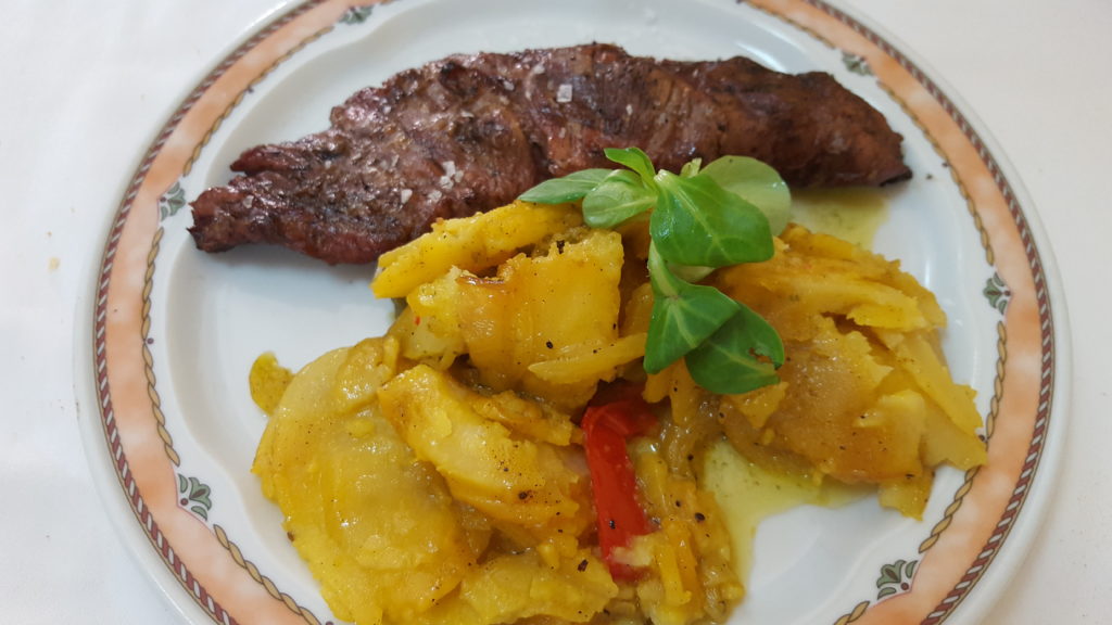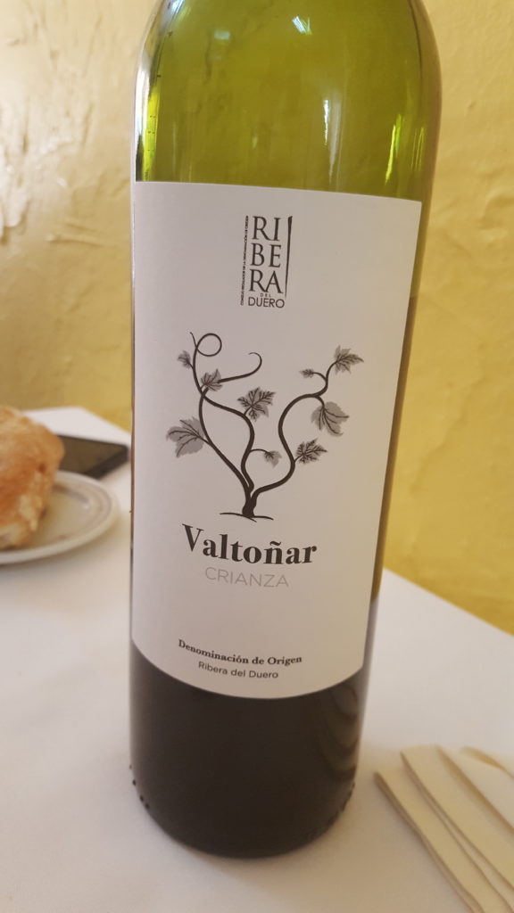 El segundo plato… debo comenzar por el sabor de la guarnición de patatas asadas, aliñadas con un toque de ajo y cebolla caramelizada. El Secreto de Cerdo Ibérico a la brasa fue nuestra opción. Carne de calidad, sabor a leña y brasa, recordando la bodega de mi padre en Cigales, provincia de Valladolid, fue memorable. La cantidad exacta; ni más ni menos. Degustamos un buen “Valtoñar” Crianza de la Denominación Ribera del Duero, servido a su justa temperatura, al contrario de otros lugares donde piensan que todo el vino ha de estar helado.